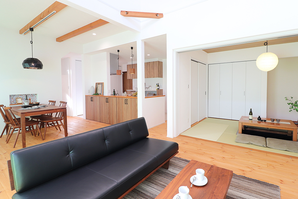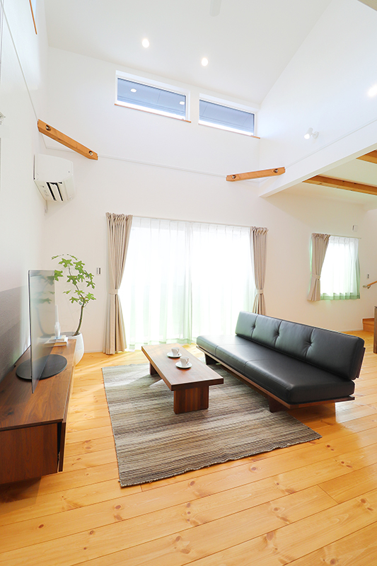 自然素材をふんだんに使った上質な空間に、広々とした勾配天井&吹き抜けのリビング。安心感と開放感を兼ね備えたリラックスできるお住まいが完成しました。