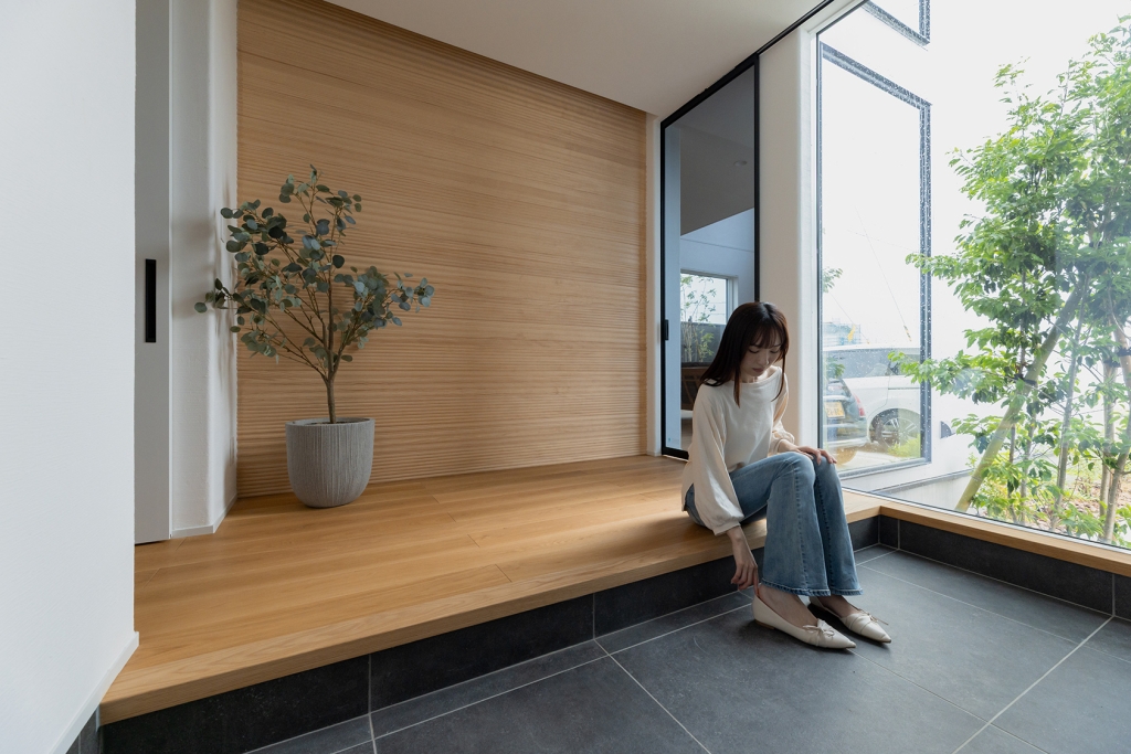 デザインウォールが映える玄関スペース。大きな窓があるので、外からの光がさし込む明るい空間に。