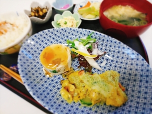 ・メイン サーモンのカレークリーム煮グラタン仕立て&豆腐と肉の詰め物