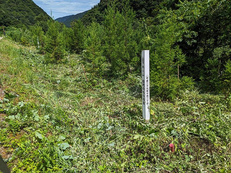 無花粉スギの苗木「立山森の輝き」を植樹して以来、苗木が大きくなるまで毎年下草刈りを行っています。