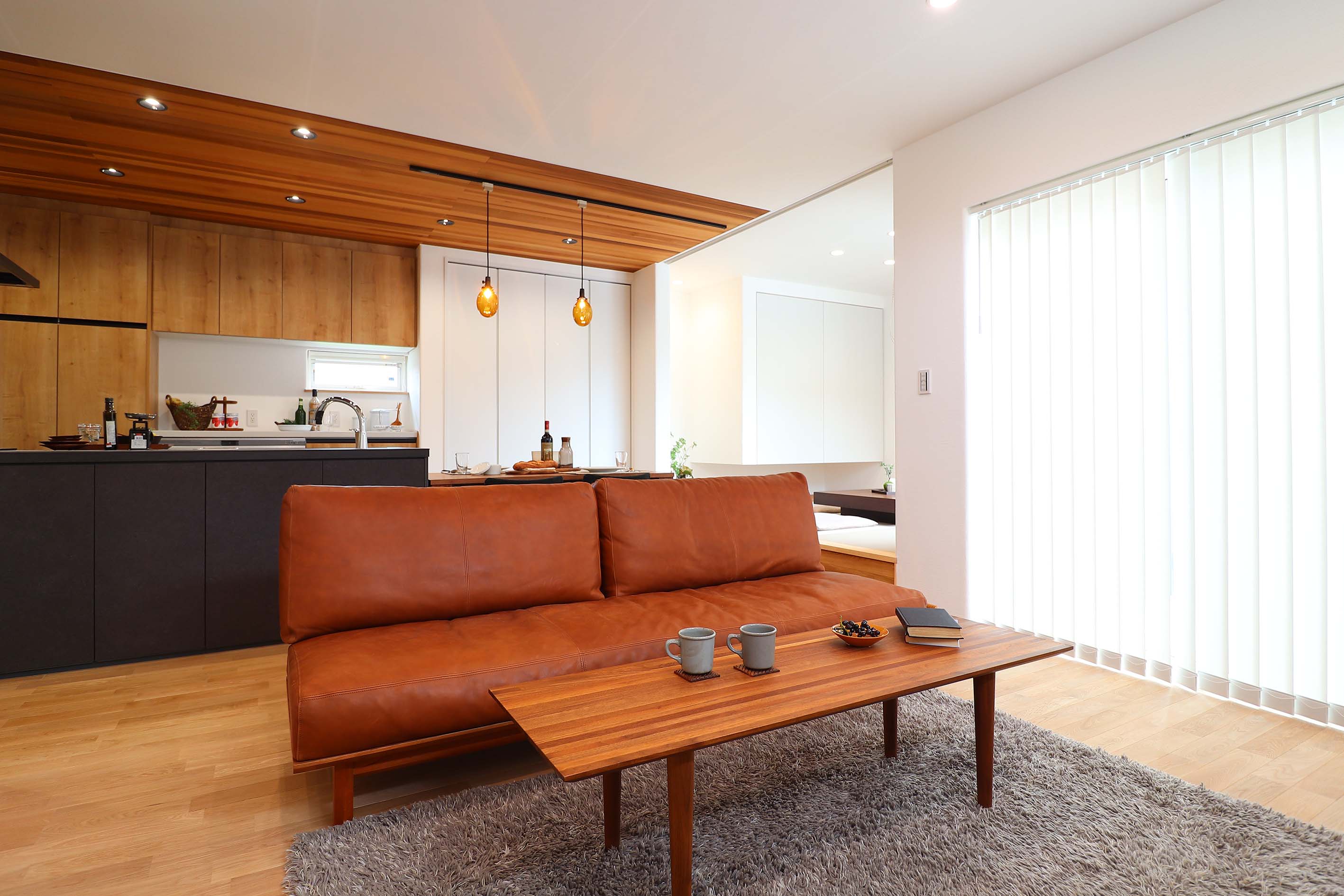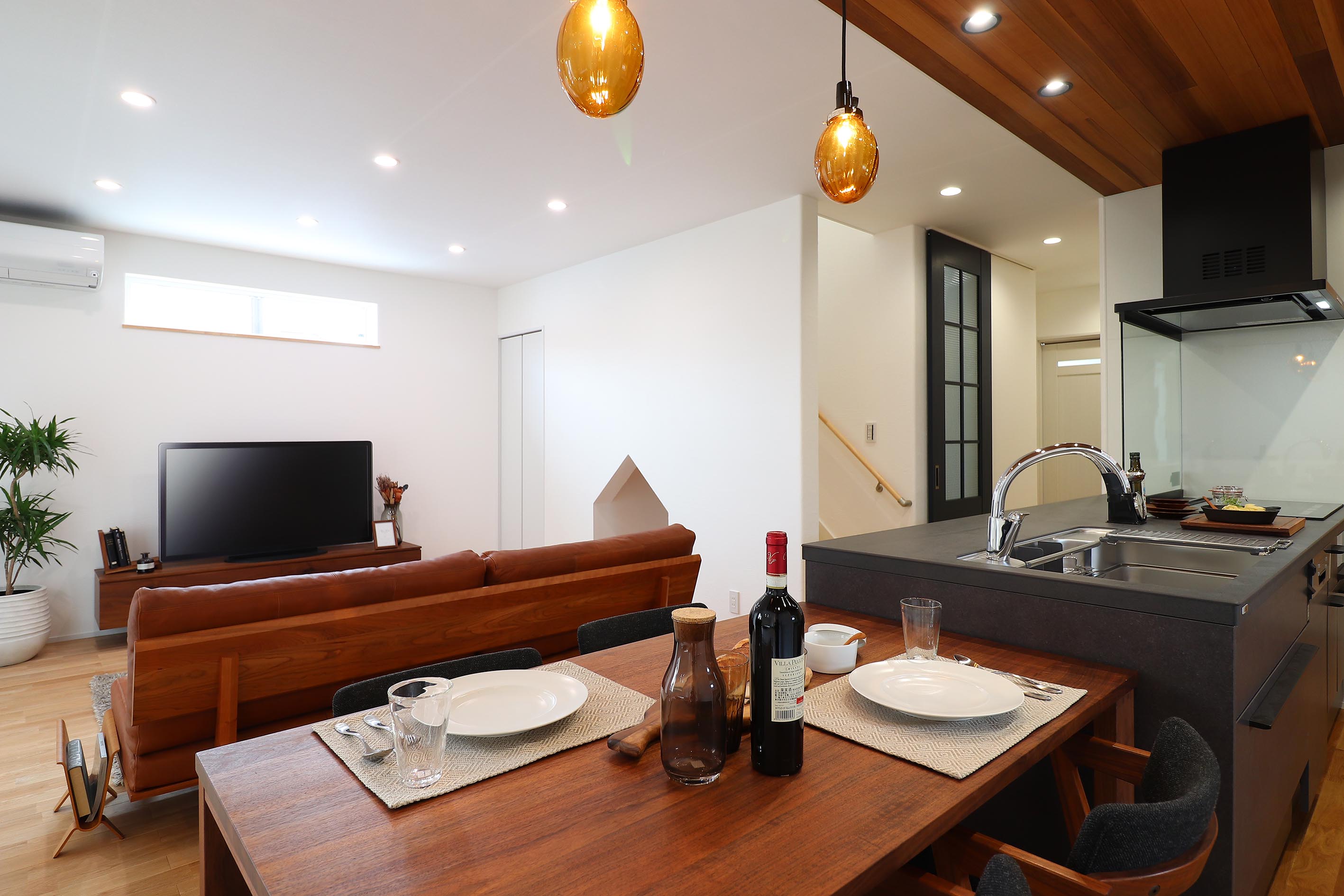 パッと目が行くのは、ブラックのオープンキッチンと濃いめ色の板張り天井。無添加漆喰とのコントラストがスタイリッシュでかっこいい!