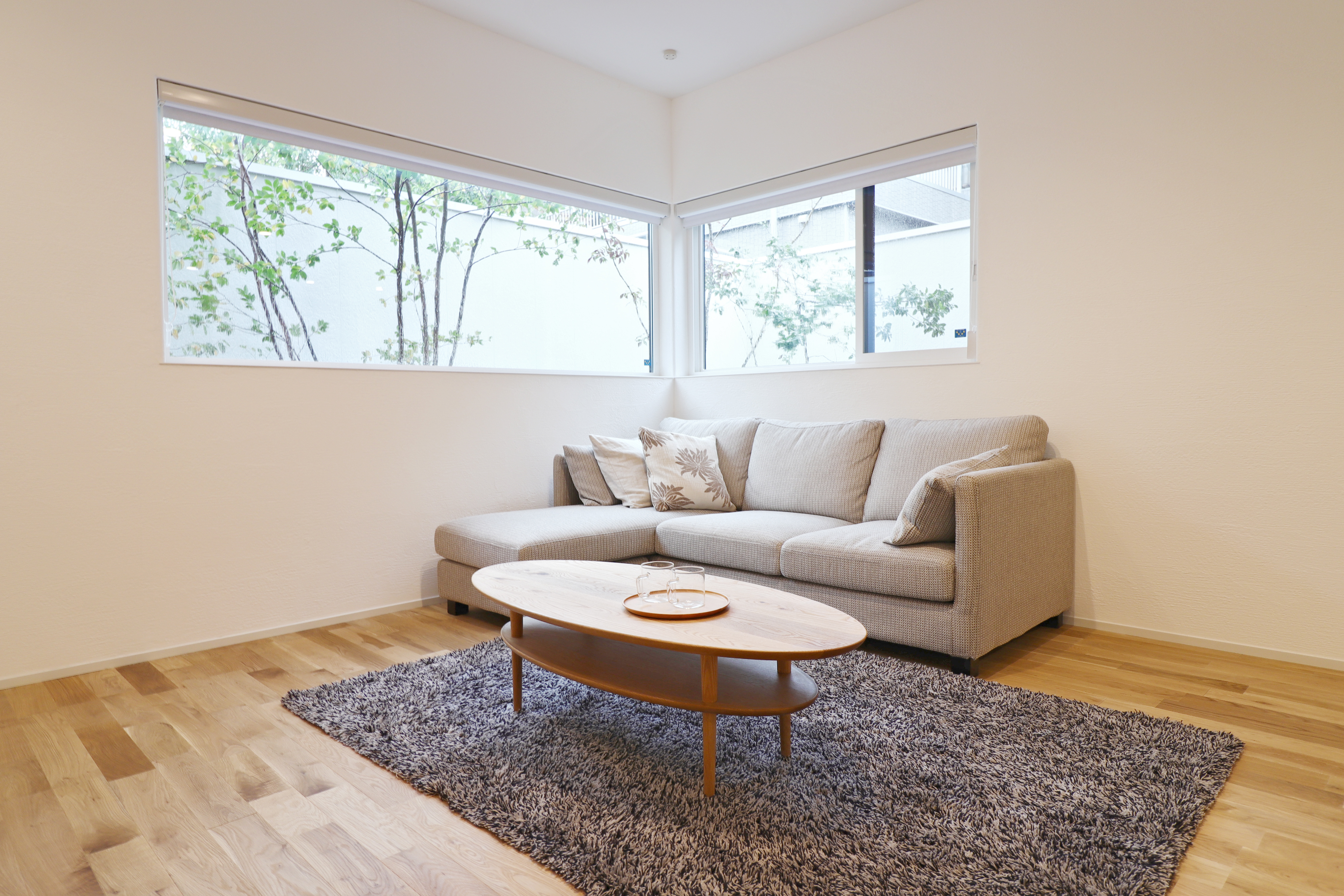 コーナーガラスのように配置された横長の窓からは縦に伸びる緑が垣間見え、リビングを落ち着きのある空間へ昇華させます。優しい自然光に包まれてのびやかに暮す、そんな家庭の光景が見えてきそうです。