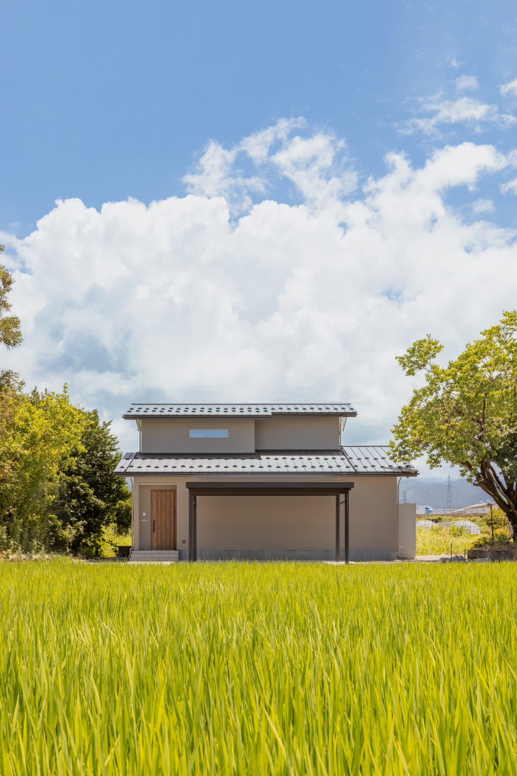 この住まいは、周囲の風景に溶け込むようにデザインされた和モダンの外観が特徴です。
