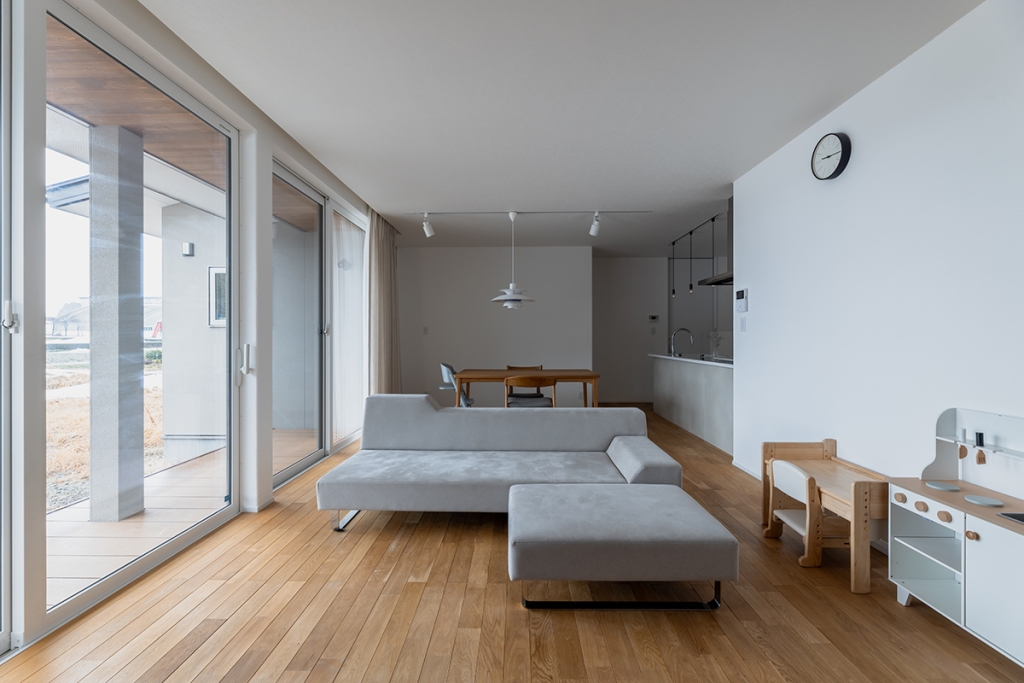 リビングは、大きな窓から広がる山の景色をパノラマで楽しむことができるよう、シンプルかつ上質な空間に仕上げられています。