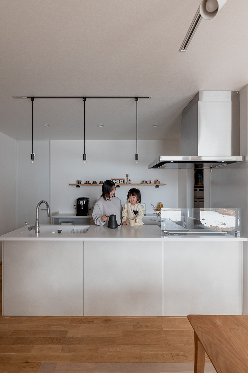 白を基調としたシンプルでモダンな造りが、家全体の雰囲気と一致し、毎日の料理が楽しくなる空間を提供します。