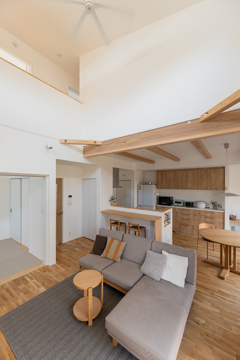 この住まいのリビングは吹き抜けによる開放感が特徴です。