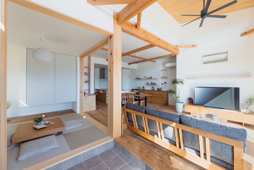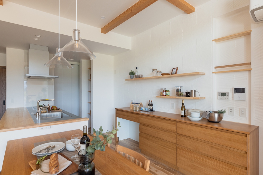 山下ホーム特有の自然素材を使用した造作棚を設けることで、室内に一体感をもたらします。