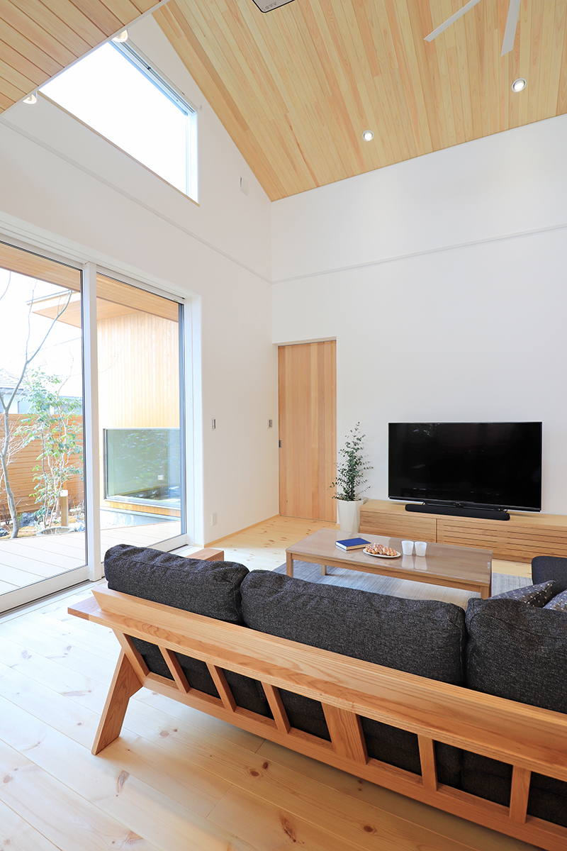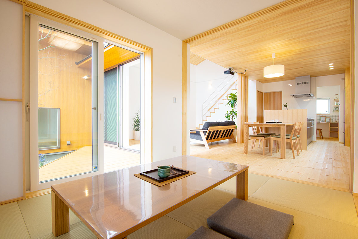 住宅街に建てられたお住まい。近隣の視線を気にすることなく、中庭から光と風を取り入れ心地よい開放的な空間を実現しました。