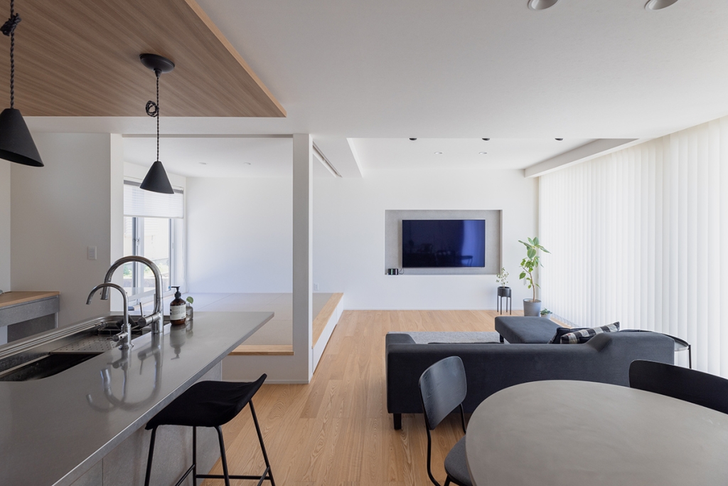 このLDKは、色味を抑えてコーディネートされたシンプルなデザインが特徴です。ナチュラルなトーンの木材や、穏やかな色合いの壁面が調和し、落ち着いた空間を作り出しています。余計な装飾を省き、シンプルながらも洗練された雰囲気に仕上げることで、家族が長時間くつろげる心地よい空間が完成しました。シンプルだからこそ、インテリアや家具が引き立ち、温かみのある空間を実現しています。