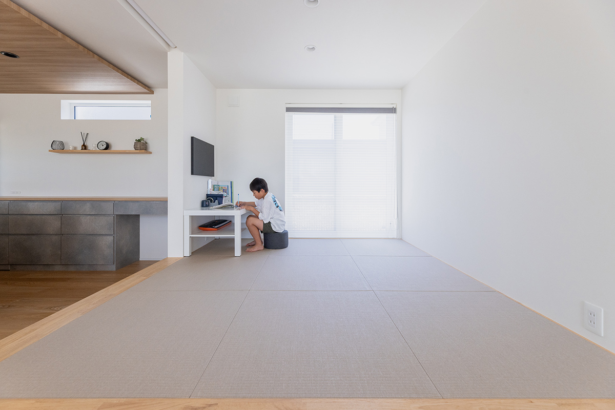小上がりの畳スペースは、お子様の勉強コーナーとして活用できるだけでなく、畳下にはおもちゃを収納できるスペースも完備。リビングをスッキリと保ちながら、家族が集まる場所として機能的に設計されています。机を置いてお子さんの学習スペースに、またゴロンとくつろぐ場所にもなる畳コーナーは、使い勝手抜群。毎日の暮らしの中で便利さを感じられる、温かみのあるスペースです。