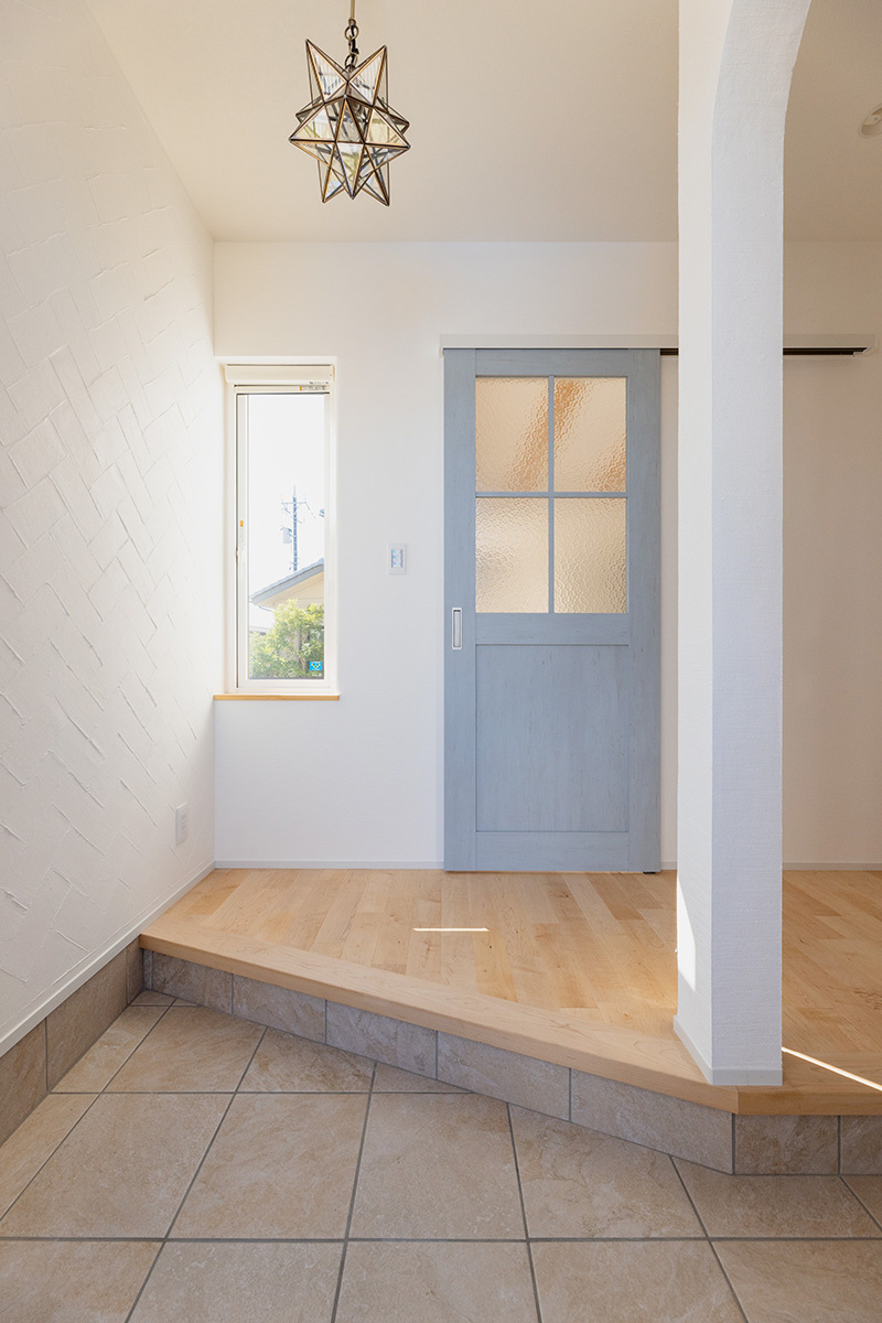 ブルーグレーのドアが出迎える、爽やかな玄関空間