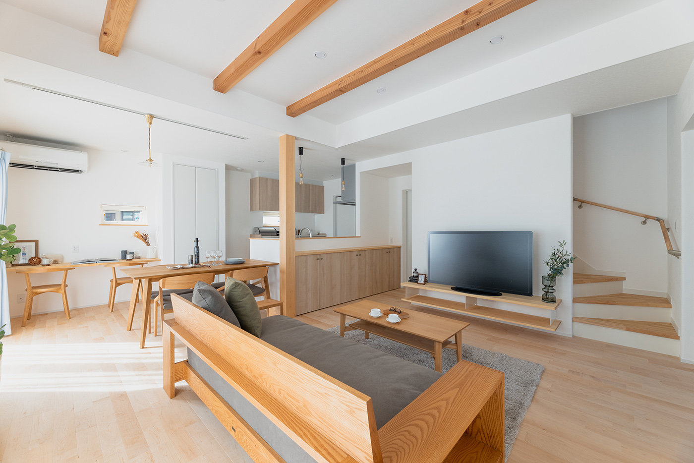 リビング空間の一角に、家族みんなが使える造作カウンターを設けました。お子さまの勉強スペースや、リモートワーク、読書タイムにも大活躍。家族の気配を感じながら、それぞれの時間を大切にできるのが魅力です。