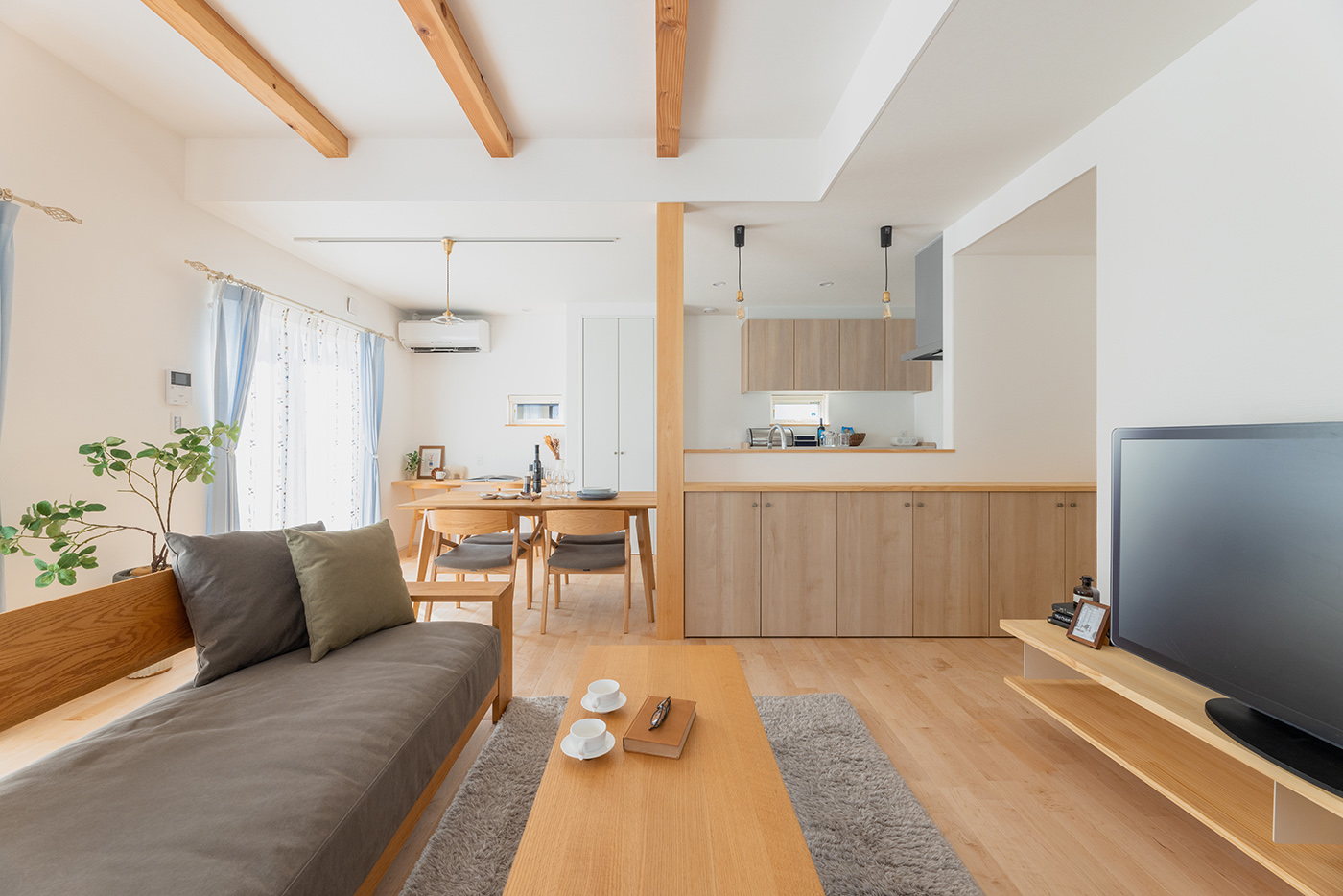 このお家では、床材にメープルのムク材を採用しています。乳白色の木肌と柔らかな木目が特徴的で、北欧スタイルのインテリアとの相性は抜群です。ナチュラルで温かみのある雰囲気を演出し、どんな家具とも調和します。時間と共に深みを増す木材の美しさが、空間に落ち着きと風格を加え、長く愛用できる一番の魅力です。