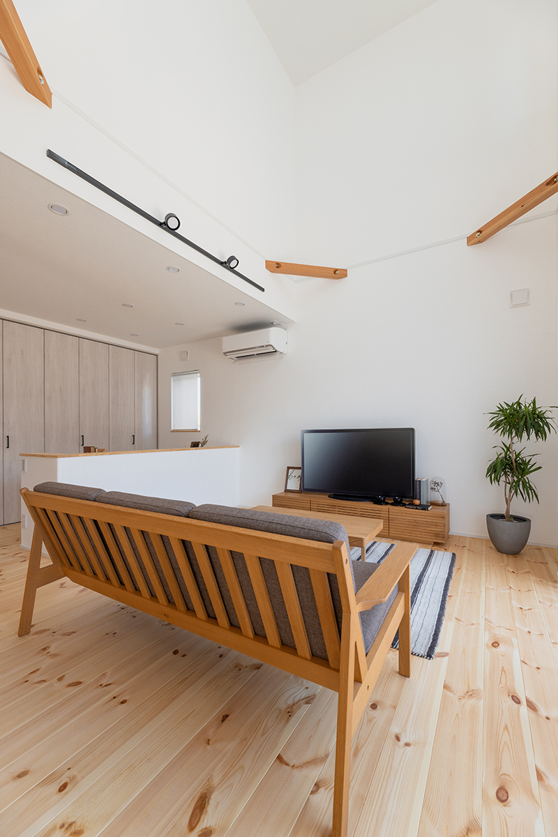 素足で歩きたくなるような心地よさと、家族みんながリラックスできる優しい空間が広がっています。