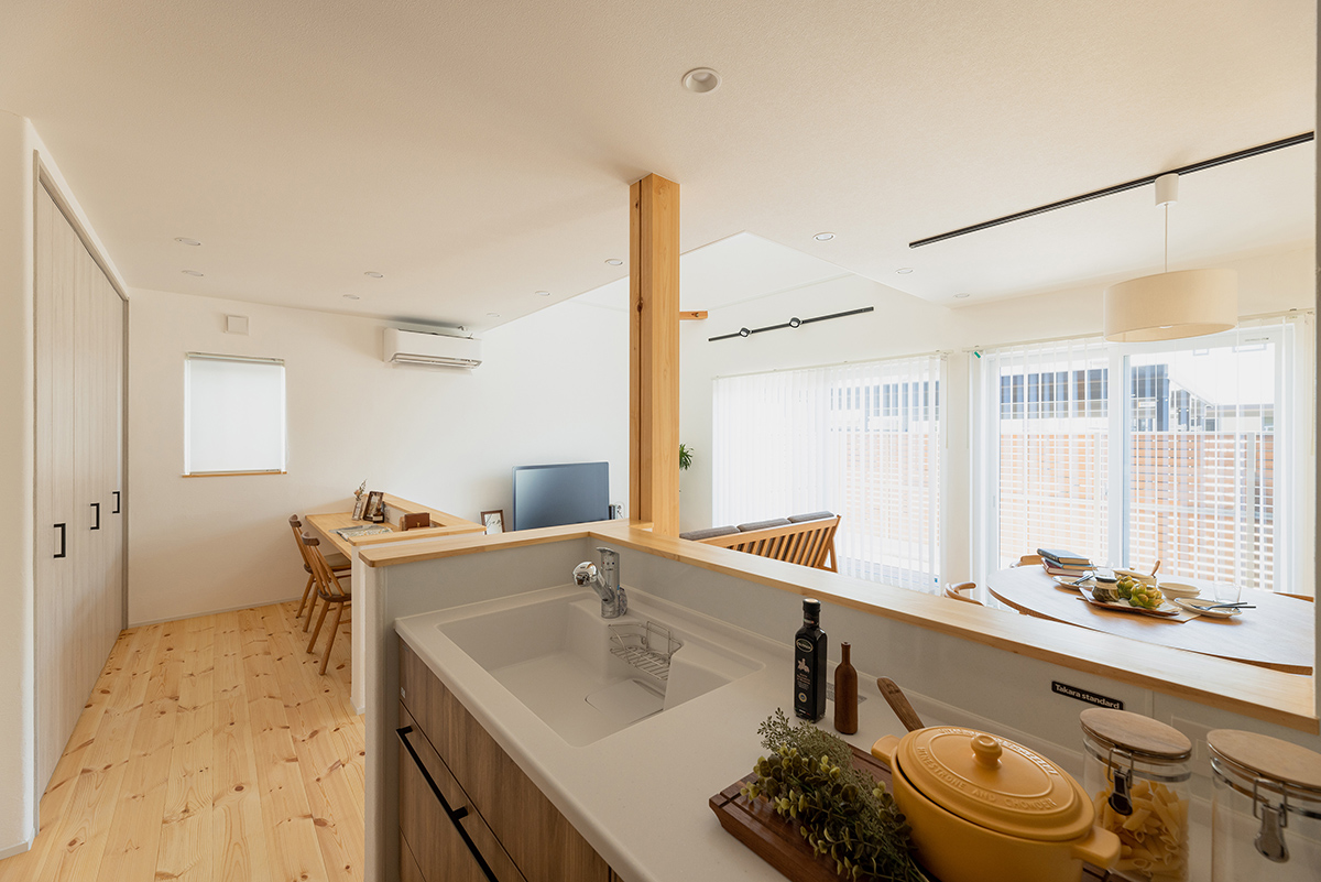 キッチン横には、家族みんなで使える便利なカウンターを設置しました。お子さまの宿題スペースとしてはもちろん、読書やちょっとしたパソコン作業、リモートワークにも活躍。キッチンからも目が届く場所なので、家事をしながらお子さまの勉強を見守れるのも嬉しいポイントです。使い方に合わせて自由に活用できる、家族に優しい設計となっています。