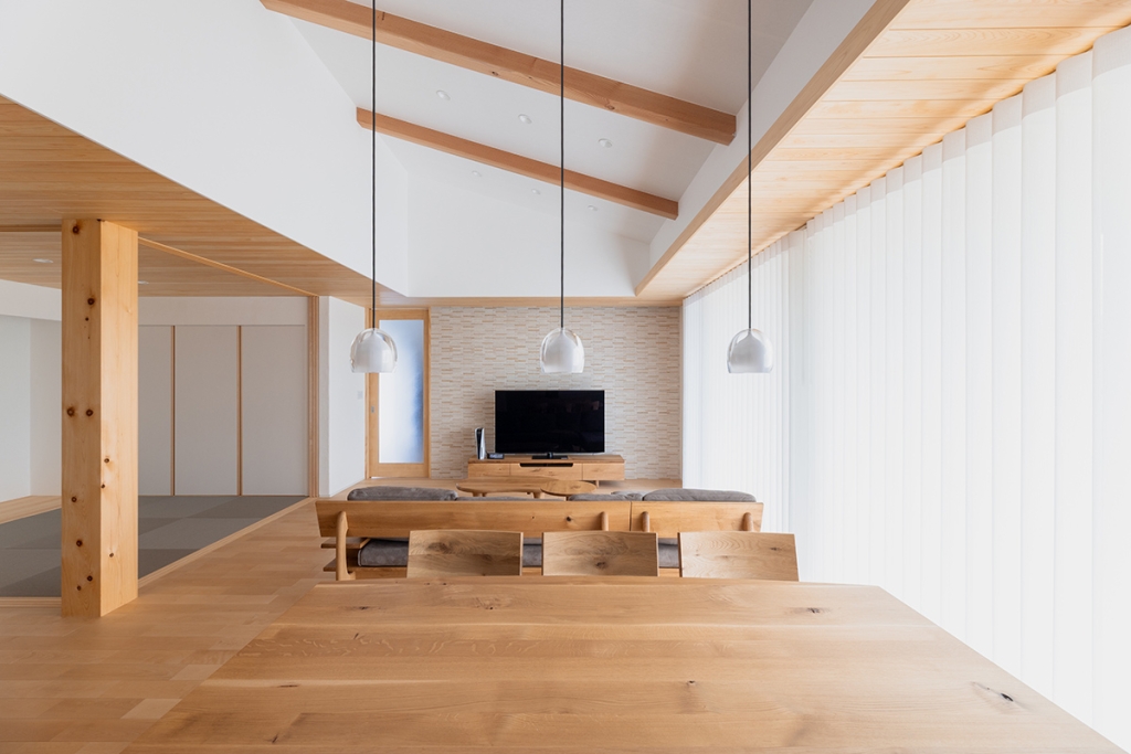 勾配天井と梁の美しいラインが印象的な、木のぬくもりあふれる平屋のリビング・ダイニング。天井や家具に至るまでトーンを揃えた木材を使うことで、空間に一体感とやさしさをもたらしています。南側には大きな窓を設け、明るさと開放感をしっかり確保。隣接する和室ともつながることで、暮らしに柔軟さと奥行きを与えた心地よい住空間です。