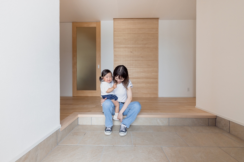 ゆとりある玄関スペースは、家族の行き来やお出かけ準備もスムーズ。木の建具や壁面の質感がやさしい印象を与え、シンプルながらも温もりを感じられる空間に仕上げました。上がり框の段差も程よく、お子さまの靴の脱ぎ履きも安心。毎日を気持ちよくスタートできる、心地よい玄関です。