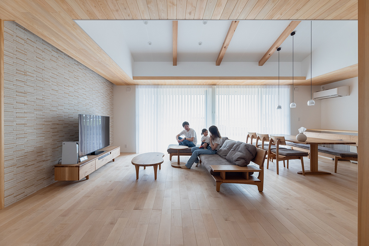 勾配天井の梁あらわしが印象的な、開放感あふれる平屋のLDK。天井や床には木をふんだんに使用し、やさしく心地よい空間に仕上がっています。大きな窓からは自然光がたっぷりと入り、日中は照明いらずの明るさ。リビング・ダイニング・キッチンがゆるやかにつながることで、家族が自然と集い、会話が生まれる暮らしを叶えました。