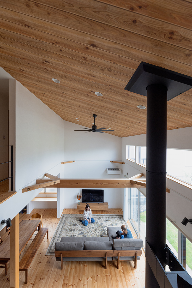 吹き抜けのリビングに設けられた薪ストーブは、空間の主役。冬は家中を優しく暖め、家族の団らんを自然と引き寄せる存在です。床・天井・梁には温もりある木材をふんだんに使用し、視覚からも暖かさを感じられます。窓を大きく設けたことで明るさと開放感が生まれ、日中は陽光が部屋全体をやさしく包み込みます。天井高を活かした縦の広がりと、木の質感が調和することで、季節ごとに表情を変える心地よい空間が完成しました。
