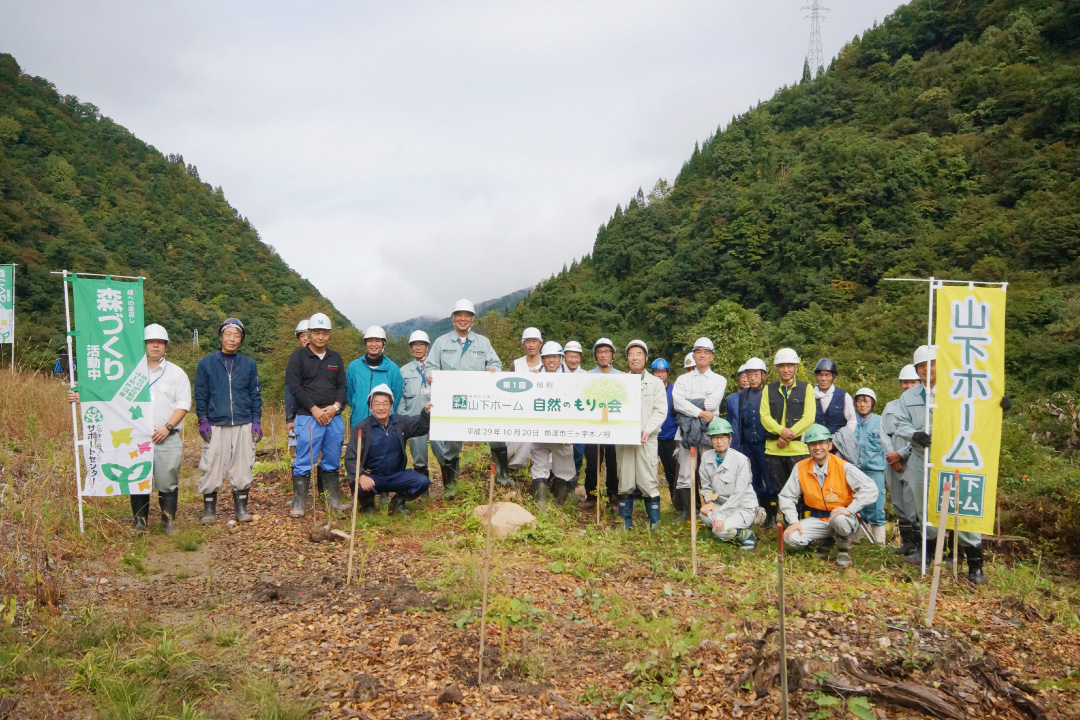 ふるさと富山のきれいな水源を守り、土砂災害を防ぎ、地球温暖化を防止していく取り組みとして、魚津市片貝川源流にて「森づくり活動」を行っています。 木を切って生業としている住宅会社として森への恩返しをしなければ、という想いで活動しています。