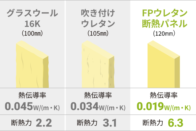 断熱材の厚さを熱伝導率で割った数値である「断熱力」は、素材ごとに異なる断熱性能を比較する際の指標として用いられます。標準で120mmの厚さの「FPウレタン断熱パネル」の断熱力は、驚きの6.3。他の断熱材と比べ、圧倒的に断熱性能の高さが際立っています。
