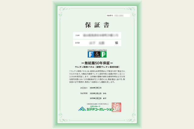 気密の測定は、専門の技術を持った気密測定技能者が、一棟ずつ装置を使って丁寧に行っています。「FPの家」は、性能劣化のほとんどない「FPウレタン断熱パネル」を使用しているので、気密性能も経年変化が非常に少なく、快適な住み心地を長く保ちます。