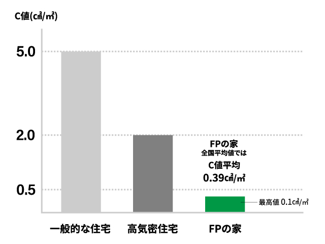 相当隙間面積(C値)の全国の実測平均値は0.39㎠/㎡と、一般的な住宅の基準値の1/20レベル。