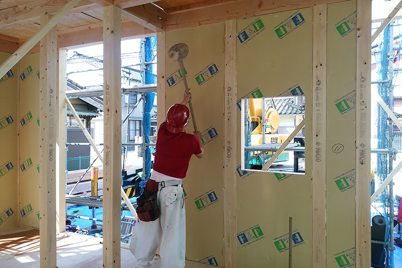 「FPウレタン断熱パネル」と柱の間のクリアランス(=隙間)は、わずか1㎜程度という高い精度。施工現場で職人がハンマー(掛矢)を使用して、ぴったりとパネルをはめ込んでいく必要があるほどです。クリアランスを最小限とすることで、高い気密性を実現できます。