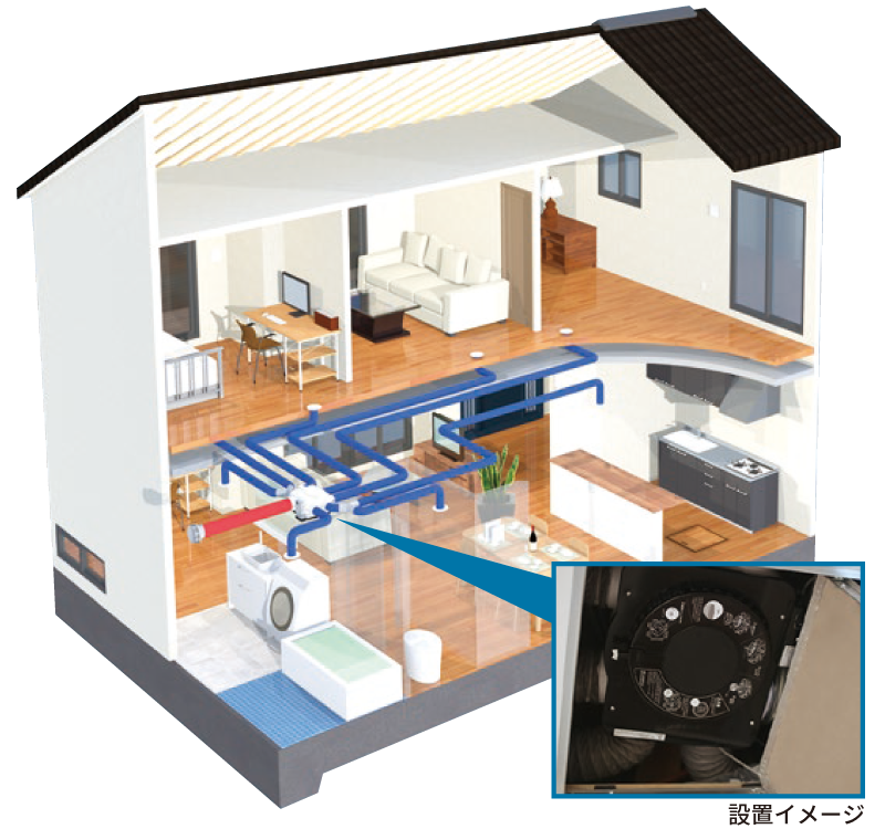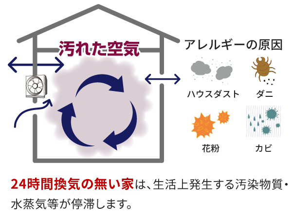 24時間換気システムは換気の際に ニオイだけではなく健康を害する汚染物質も室内から排出し、 常に室内をキレイに保ちます。